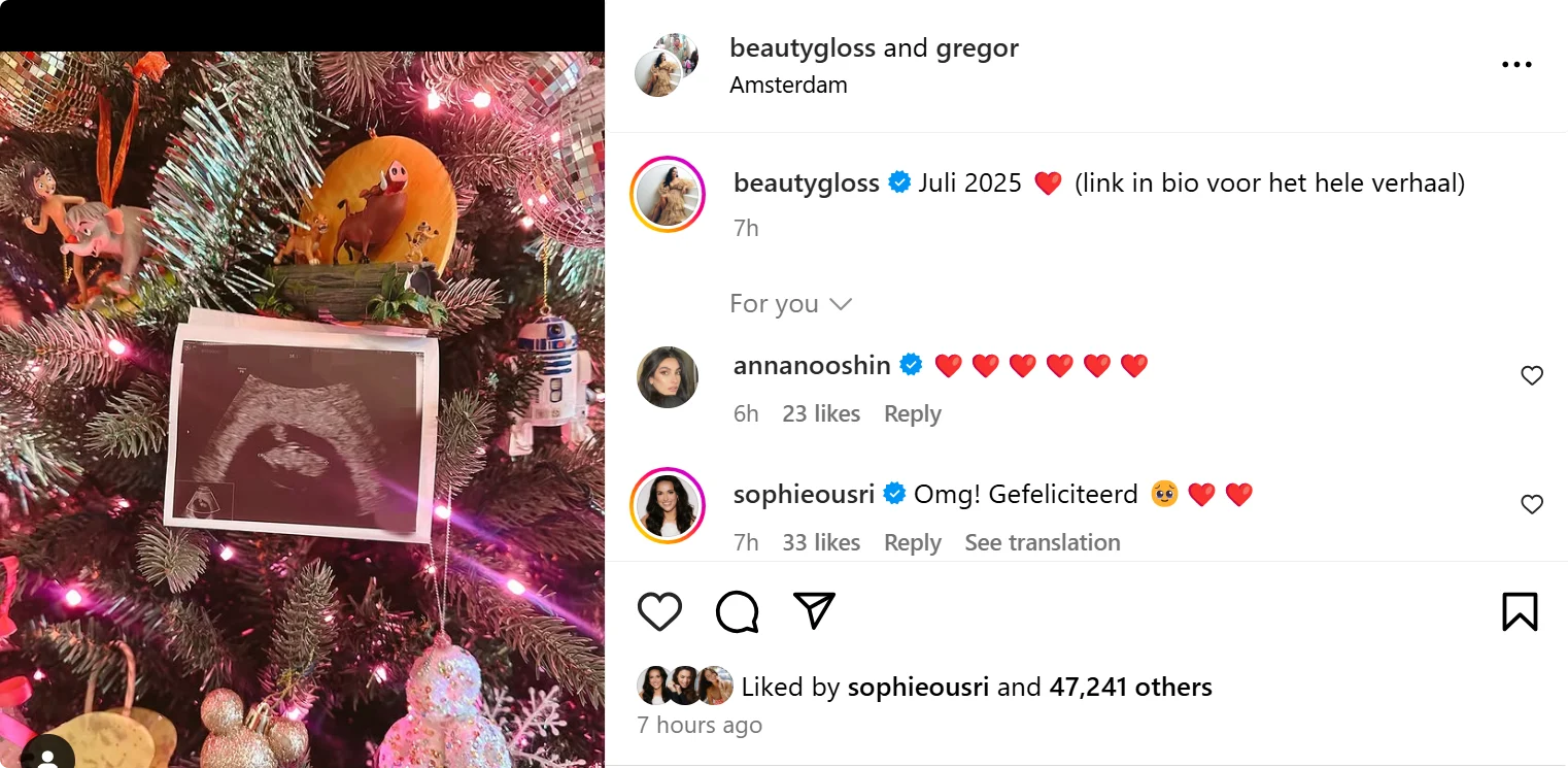 Dat deelt het gelukkige stel op Eerste Kerstdag op Instagram én ze vertellen erover in een vlog op het YouTube-kanaal van Mascha (zie onderstaande video). Op Instagram laten Mascha en Gregor met een echofoto bij de kerstboom weten dat Mascha opnieuw in verwachting is. "Juli 2025", schrijft het stel bij de feestelijke foto. In de vlog op het YouTube-kanaal van Mascha vertellen de twee meer over de zwangerschap. "Het gaat gebeuren", begint Gregor enthousiast. "Nummer twee", vult Mascha stralend aan. "Ik ben zwanger. We verwachten een tweede kindje."