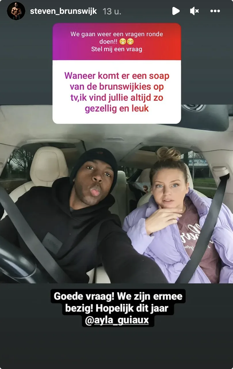 Een fan van de familie Brunswijk vraagt op Instagram wanneer er een soap van de 'Brunswijkkies' op televisie komt. "Ik vind jullie altijd zo gezellig en leuk", voegt de volger eraan toe. Steven vindt het een goede vraag en reageert bij een foto van hem en zijn vrouw: "Wij zijn ermee bezig. Hopelijk dit jaar".