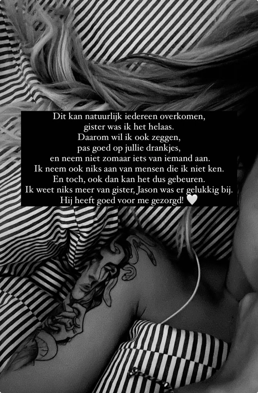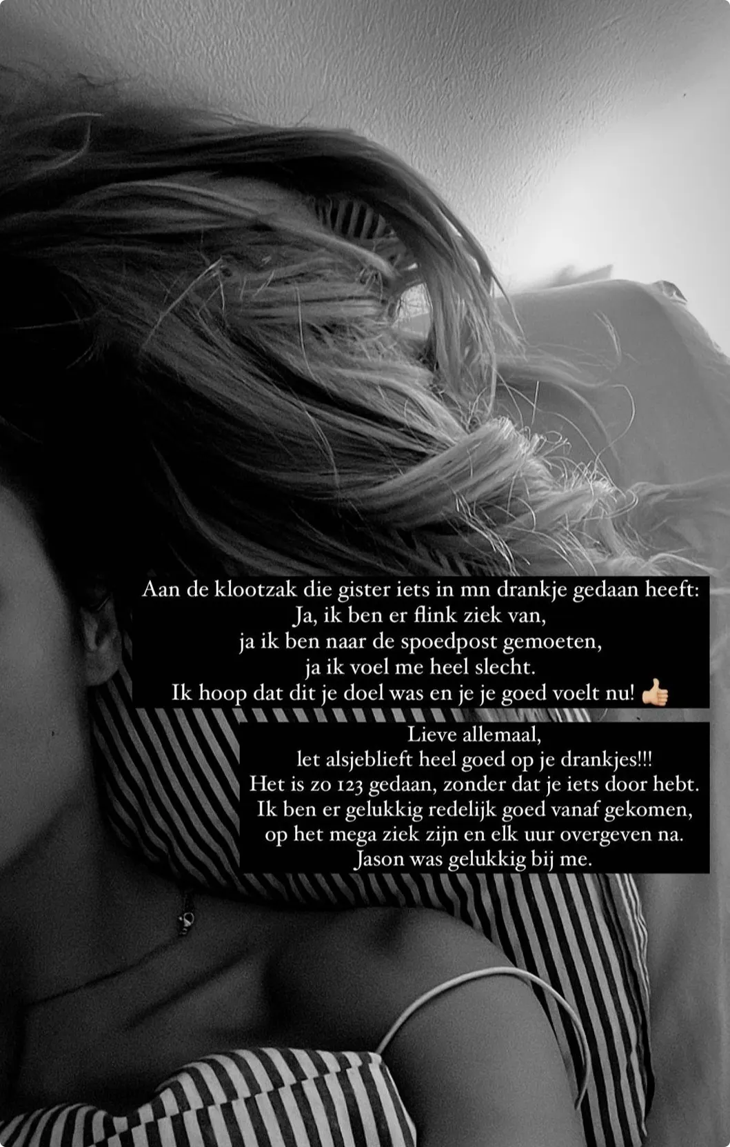 In een tweede Story waarschuwt ze nogmaals haar volgers. "Dit kan natuurlijk iedereen overkomen, gisteren was ik het helaas. Daarom wil ik ook zeggen: pas goed op jullie drankjes, en neem niet zomaar iets van iemand aan. Ik neem ook niks aan van mensen die ik niet ken. En toch; ook dan kan het gebeuren, dus. Ik weet niks meer van gisteren. Jason was er gelukkig bij, hij heeft goed voor me gezorgd."
