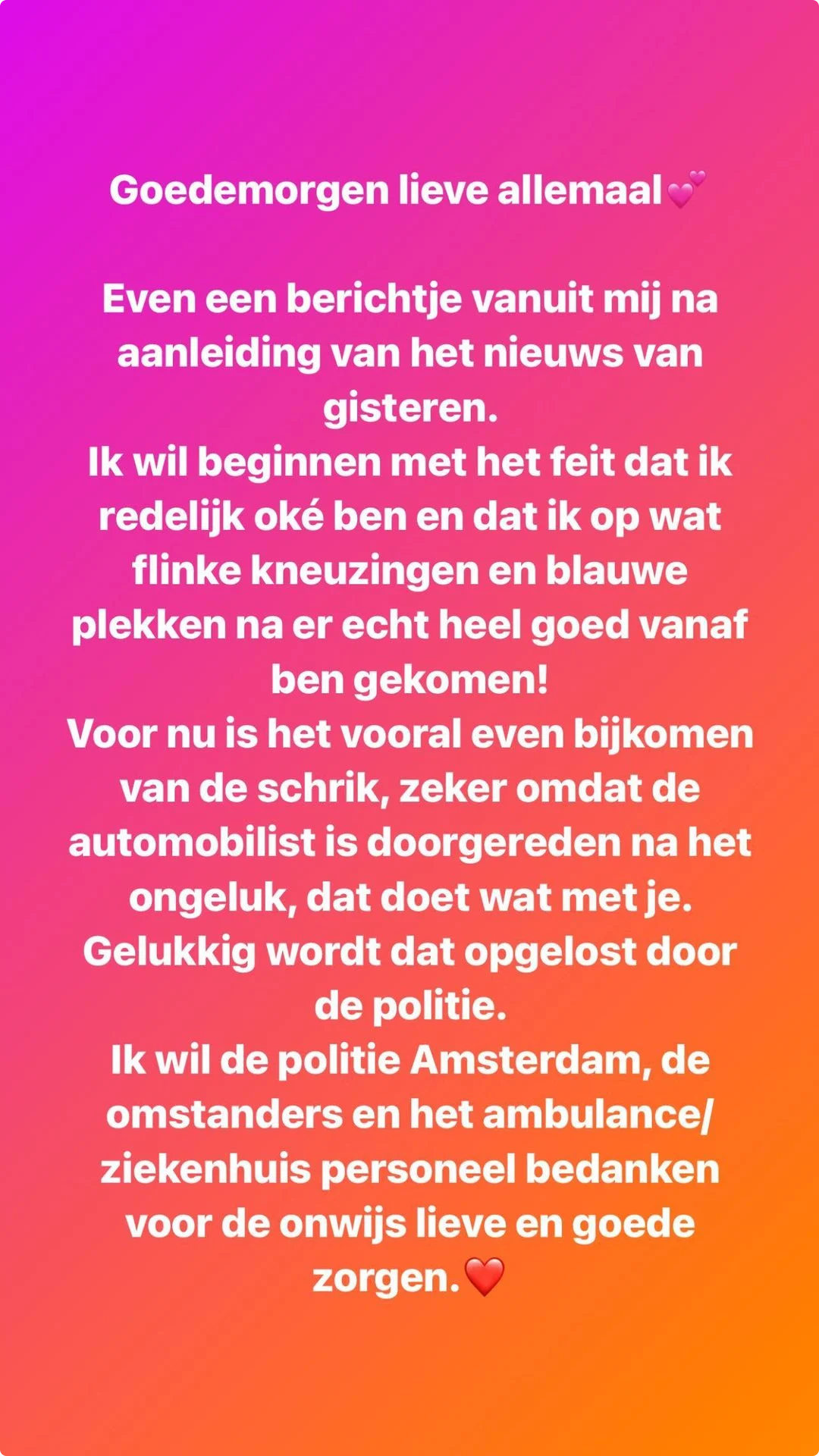 Ook schrijft Loiza ontzettend dankbaar te zijn voor alle hulp: "Ik wil de politie Amsterdam, de omstanders en het ambulance- en ziekenhuispersoneel bedanken voor de onwijs lieve en goede zorgen".