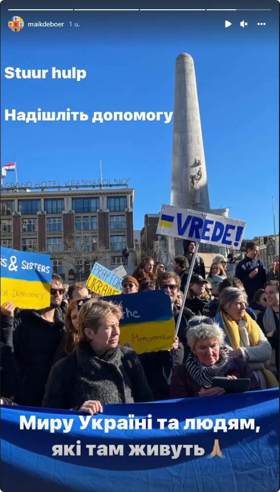Victoria Koblenko deelt een foto op Instagram, waarop zij samen met een aantal andere demonstranten staat. Ze draagt een bord met de tekst 'Put in some love'. Ook op Instragram plaatste Koblenko, zelf van Oekraïense komaf, verscheidene foto's en video's van de actie op het Amsterdamse plein.