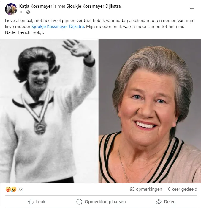 "Lieve allemaal, met heel veel pijn en verdriet heb ik afscheid moeten nemen van mijn lieve moeder Sjoukje Kossmayer Dijkstra. Mijn moeder en ik waren mooi samen tot het eind", schrijft haar dochter op Facebook.