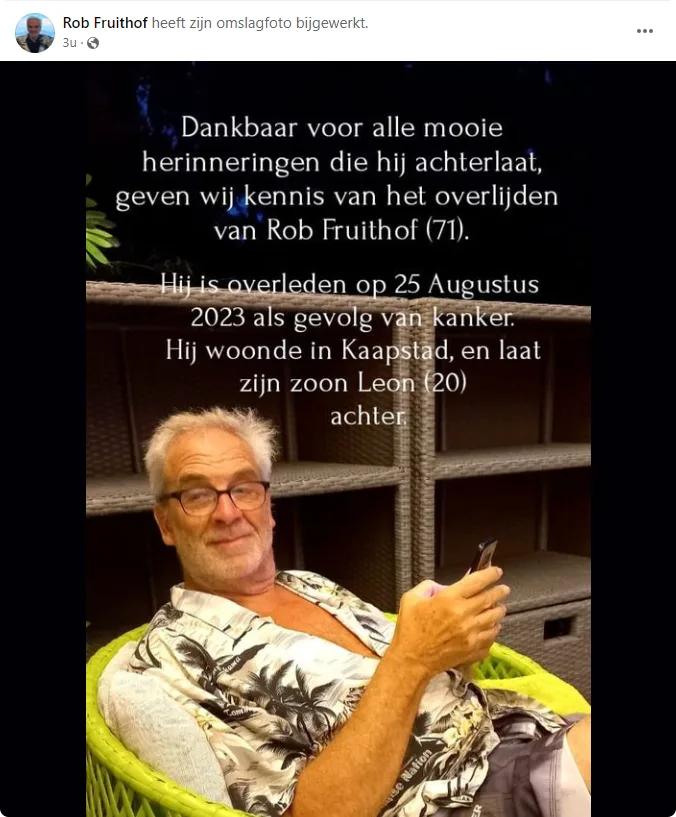 "Dankbaar voor alle mooie herinneringen die hij achterlaat, geven wij kennis van het overlijden van Rob Fruithof (71)", staat er te lezen op de Facebook-pagina van Rob. "Hij is overleden op 25 augustus 2023 als gevolg van kanker. Hij woonde in Kaapstad, en laat zijn zoon Leon (20) achter."