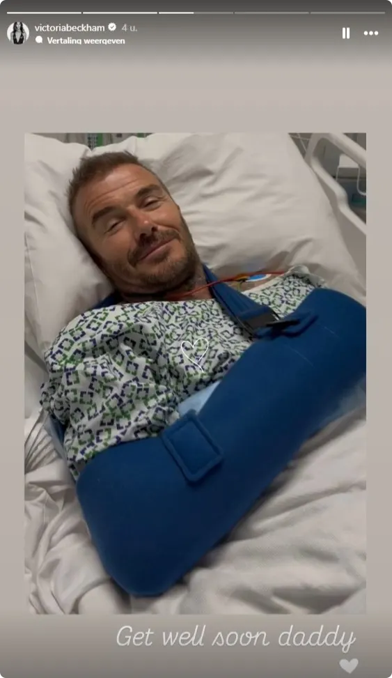 David Beckham ligt in het ziekenhuis. Zijn vrouw, voormalig Spice Girl Victoria Beckham over wie een Netflix-serie in de maak is (zie video), deelde vrijdag een foto op Instagram van de 50-jarige ex-voetballer in een ziekenhuisbed.