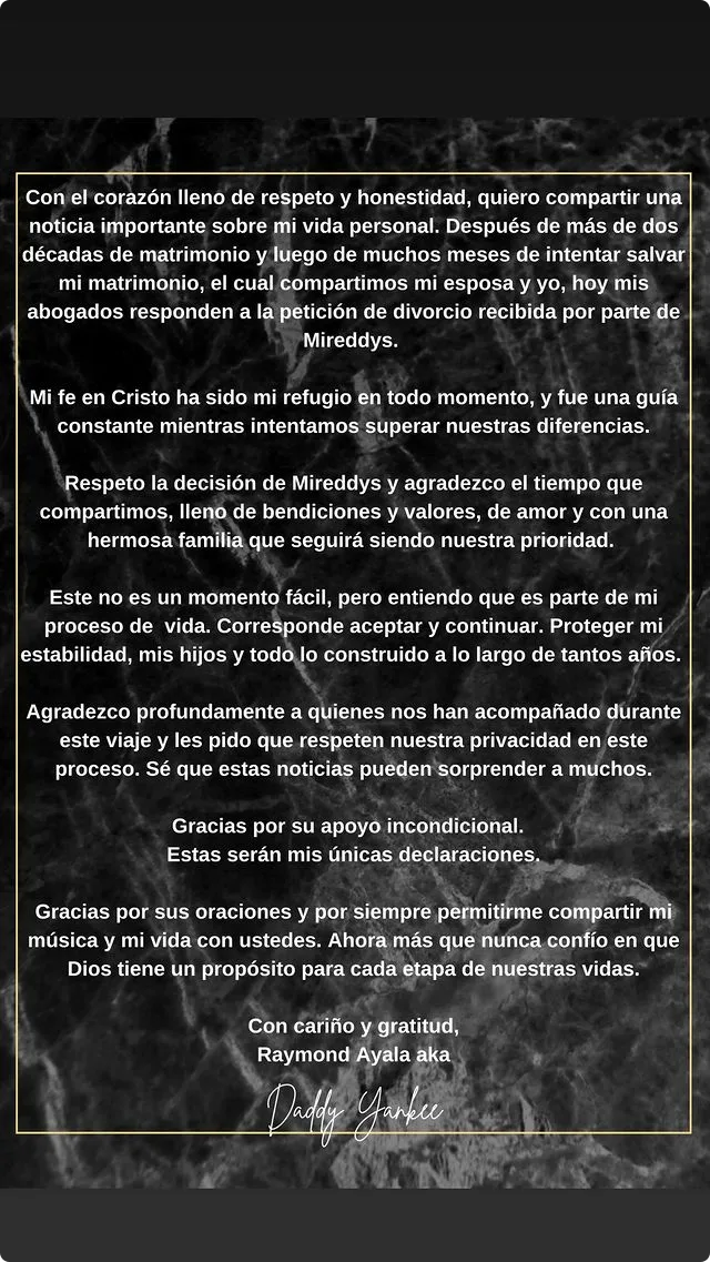 Daddy Yankee geeft aan dat "dit geen gemakkelijke tijd" is. "Maar ik begrijp dat dit deel uitmaakt van mijn levensproces. Het is tijd om te accepteren en verder te gaan." De artiest vraagt om privacy in de komende tijd.
