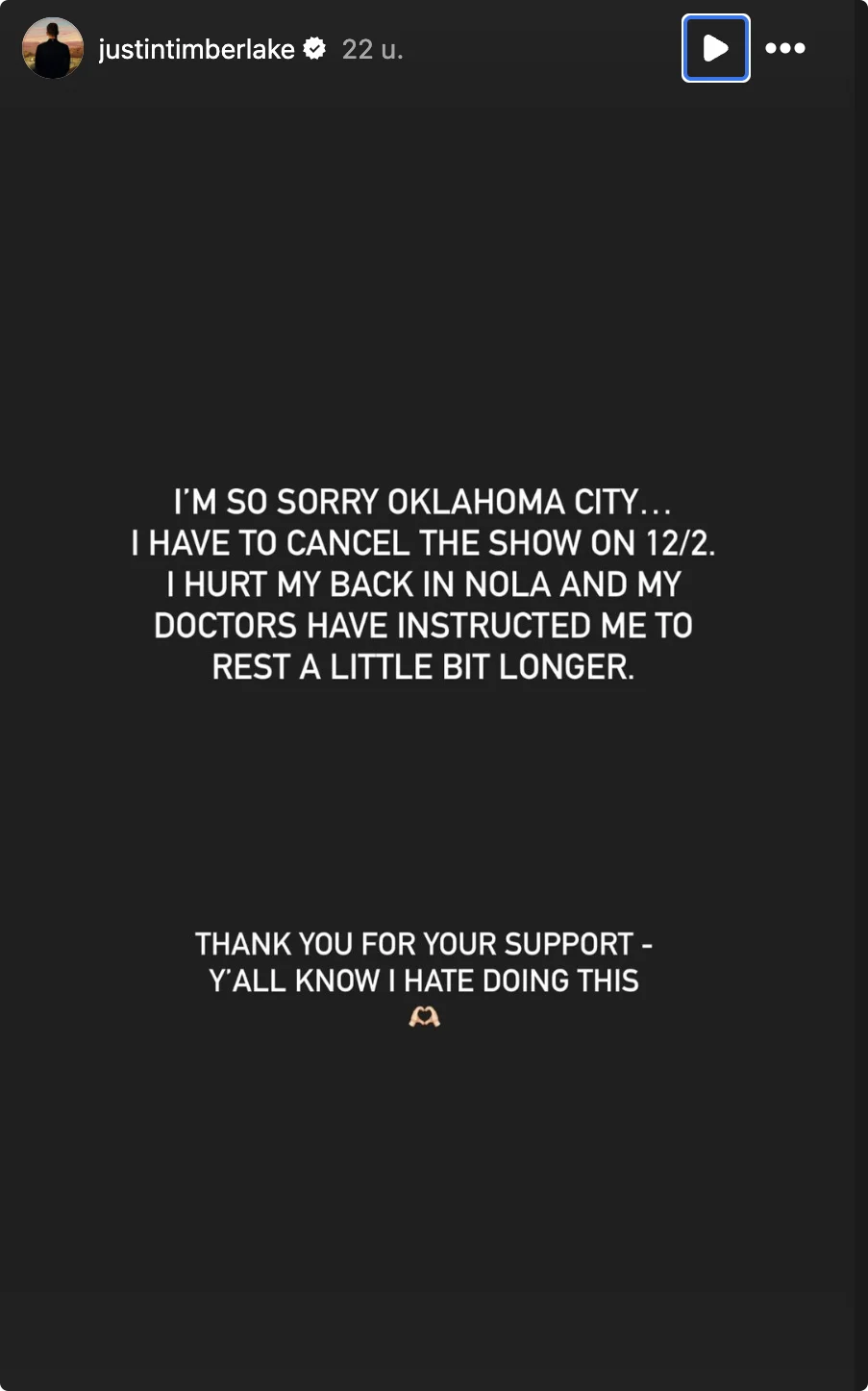 "Het spijt me zo, Oklahoma City... Ik moet de show op 2 december afzeggen", begint Justin in zijn bericht. "Ik heb mijn rug geblesseerd in New Orleans en mijn artsen hebben me geadviseerd nog langer rust te nemen. Bedankt voor jullie steun", vervolgt hij richting zijn fans. "Jullie weten dat ik hier een hekel aan heb." Mensen met een kaartje voor de show krijgen hun geld terug.
