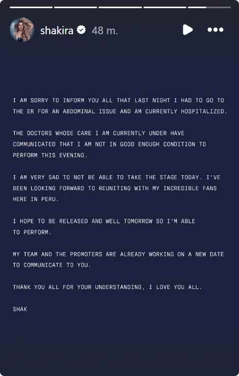 Door haar ziekenhuisopname moet Shakira in elk geval haar optreden zondag in hoofdstad Lima schrappen. Volgens haar artsen is ze daar momenteel te zwak voor. "Ik vind het heel jammer dat ik vandaag niet op het podium kan staan. Ik keek er enorm naar uit om weer samen te zijn met mijn geweldige fans hier in Peru", schrijft ze.