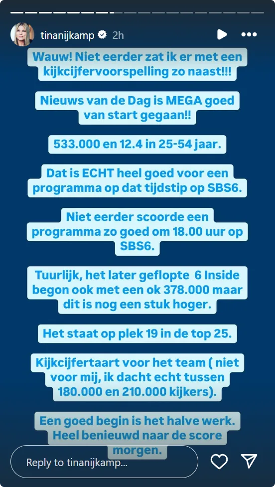 Tina's aanvankelijke voorspelling voor Nieuws van de Dag zag er niet heel rooskleurig uit, maar het tegendeel werd gauw na de eerste uitzending bewezen. "Nieuws van de Dag is MEGA goed van start gegaan", aldus Tina op haar Instagram Story. "533.000 kijkers en 12.4% marktaandeel in de commerciële doelgroep 25-54 jaar. Dat is écht heel goed voor een programma op dat tijdstip op SBS6."