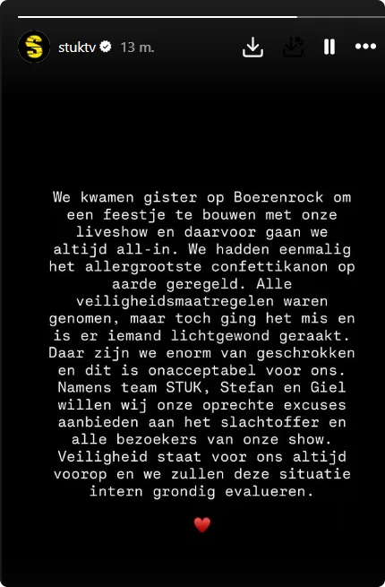 Op Instagram laten de mannen van StukTV weten geschrokken te zijn en het incident te betreuren. Ze bieden ook hun excuses aan aan het slachtoffer en de bezoekers van het festival. Ze benadrukken dat "alle veiligheidsmaatregelen" waren genomen. Volgens StukTV werd eenmalig gebruik gemaakt van het "allergrootste confettikanon ter aarde". Hun hele reactie is hieronder te zien.