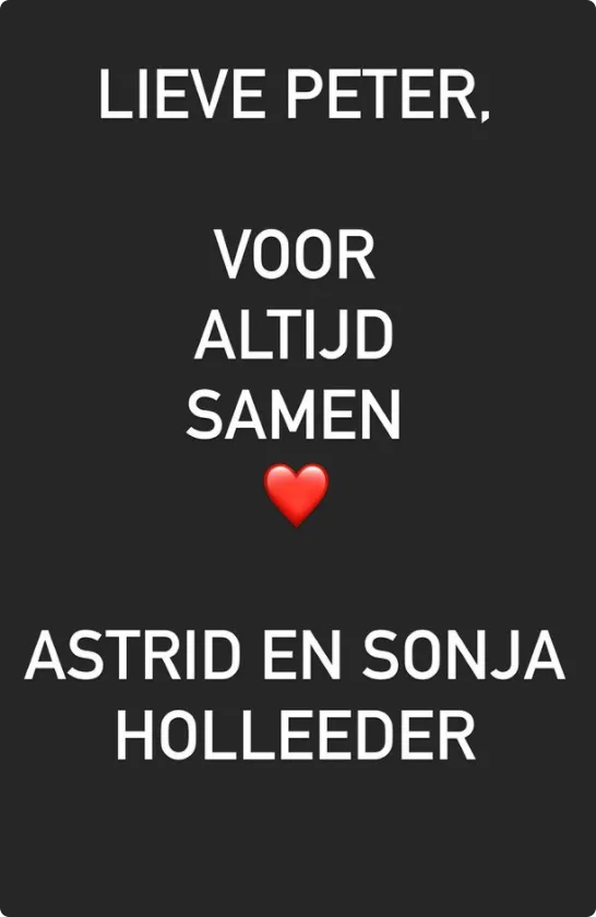 Via het Instagram-account van Miljuscha Witzenhausen hebben Astrid en Sonja Holleeder een afscheidswoordje gericht aan Peter R. de Vries. "Lieve Peter, voor altijd samen. Astrid en Sonja Holleeder", luidt hun bericht, voorzien van een hartje.