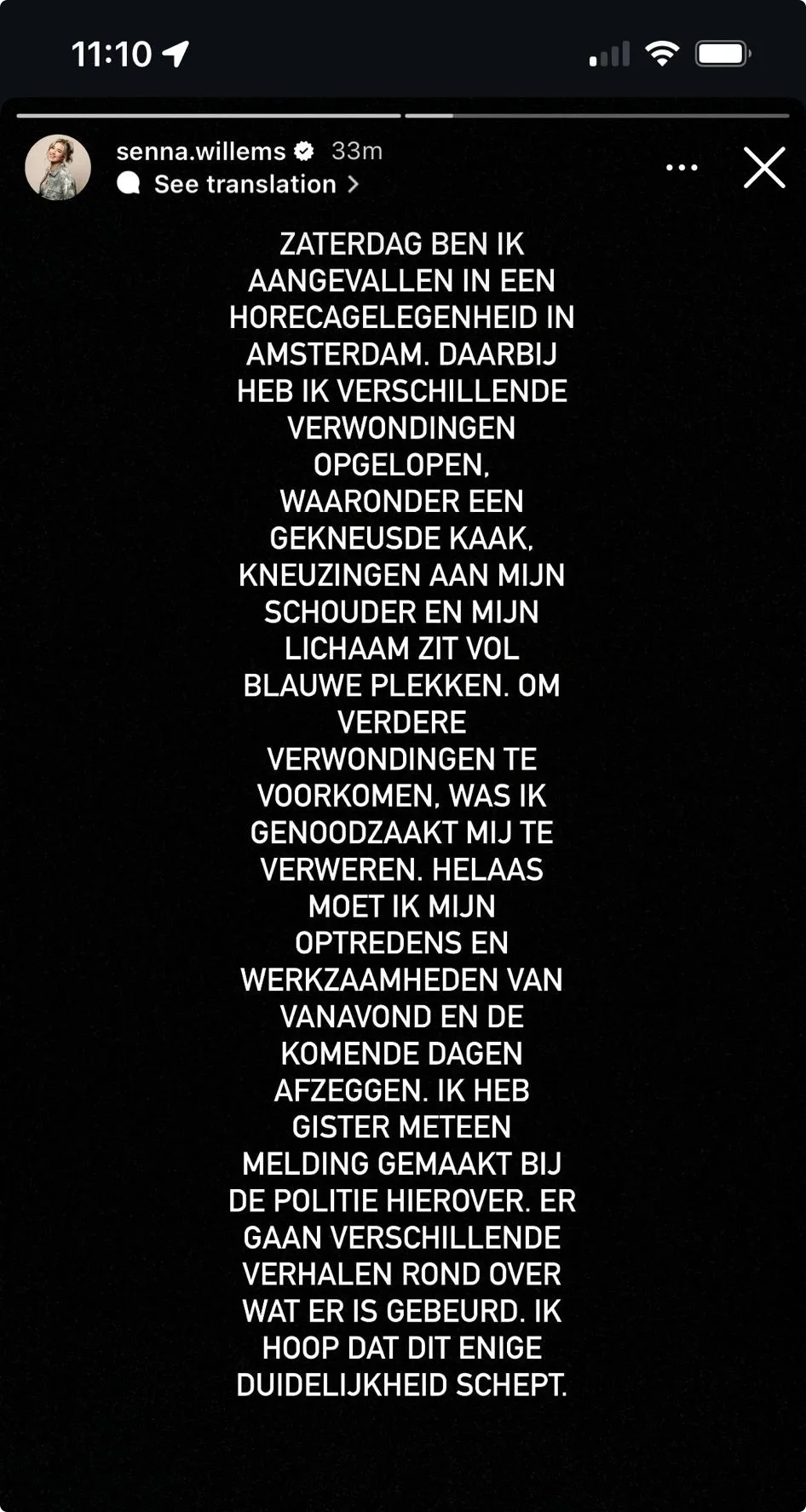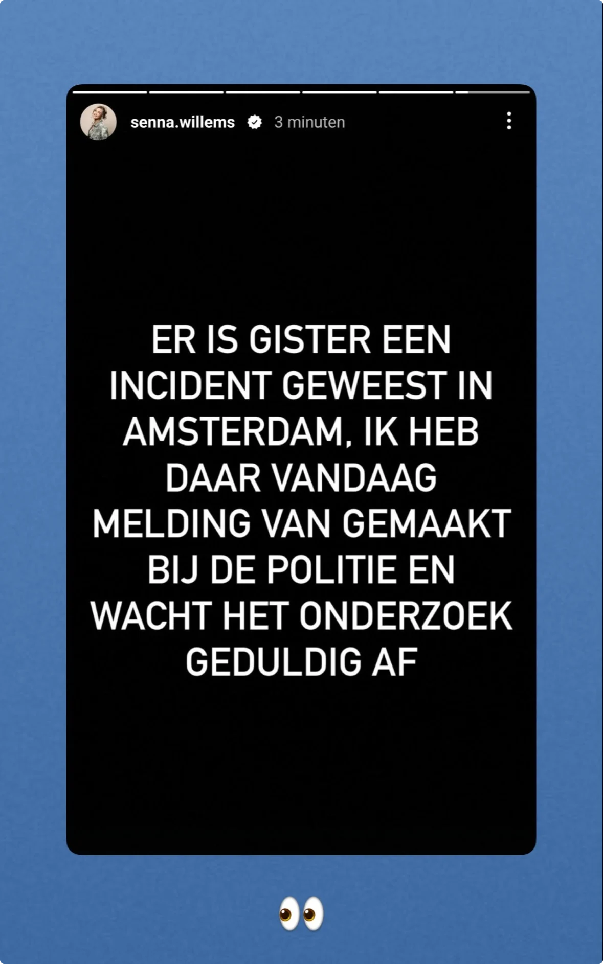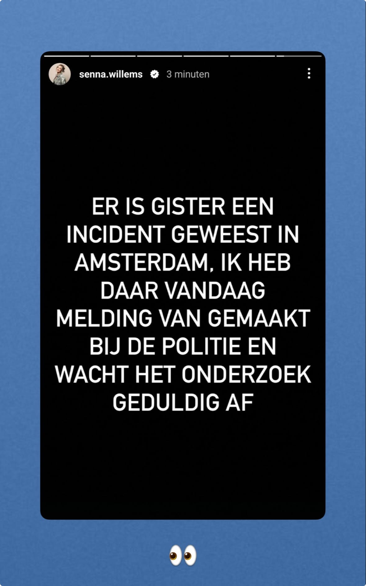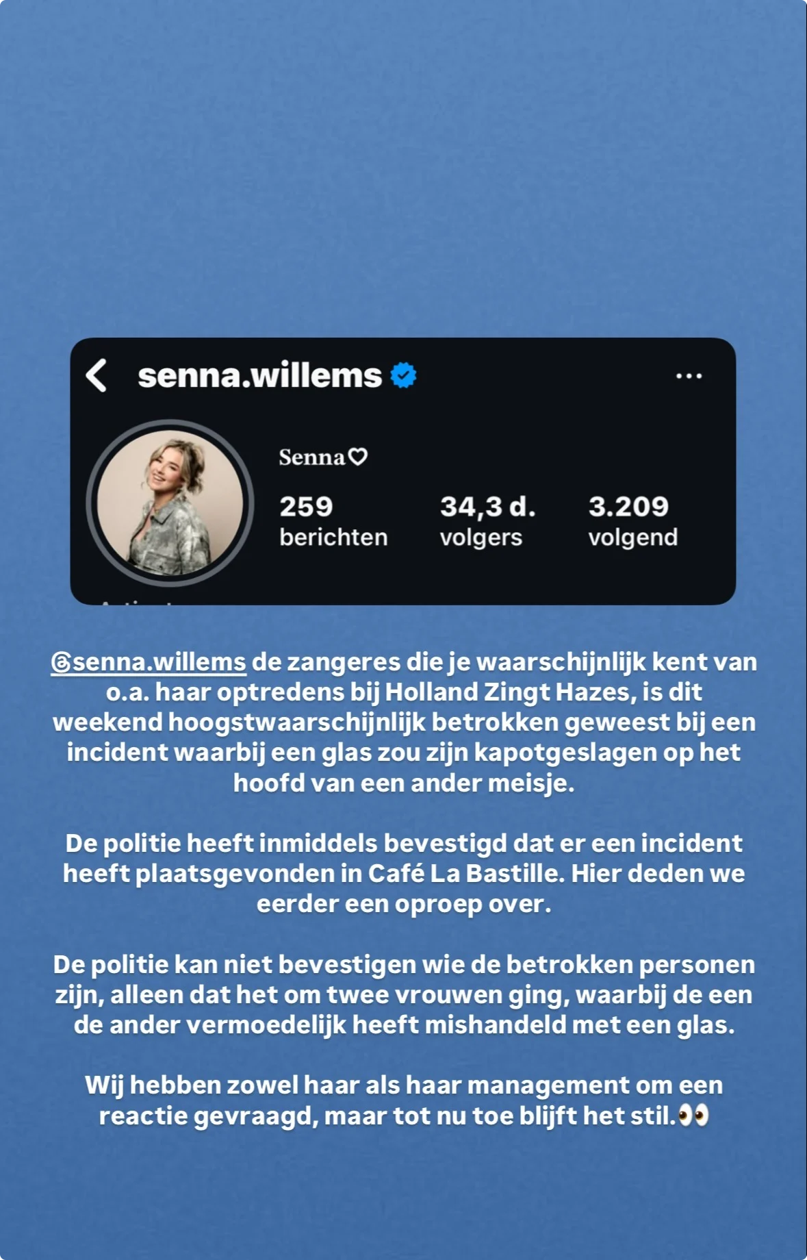 De vrouw zou behoorlijk toegetakeld zijn en maar liefst zeven hechtingen hebben. De politie heeft aan Shownieuws bevestigd dat er inderdaad een incident is geweest in het café waarbij een vrouw gewond is geraakt en ook Senna zelf heeft op Instagram gereageerd. Zij schrijft: "Er is gisteren een incident geweest in Amsterdam. Ik heb daar vandaag melding van gemaakt bij de politie en wacht het onderzoek geduldig af."