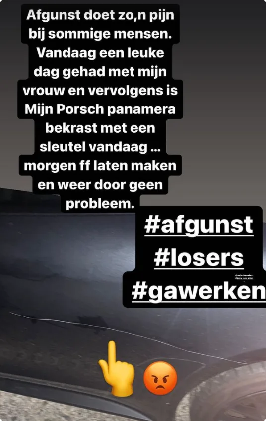 "Afgunst doet zo'n pijn bij sommige mensen", zegt de volkszanger bij een foto van de schade. "Vandaag een leuke dag gehad met mijn vrouw en vervolgens is mijn Porsche Panamera bekrast met een sleutel vandaag."