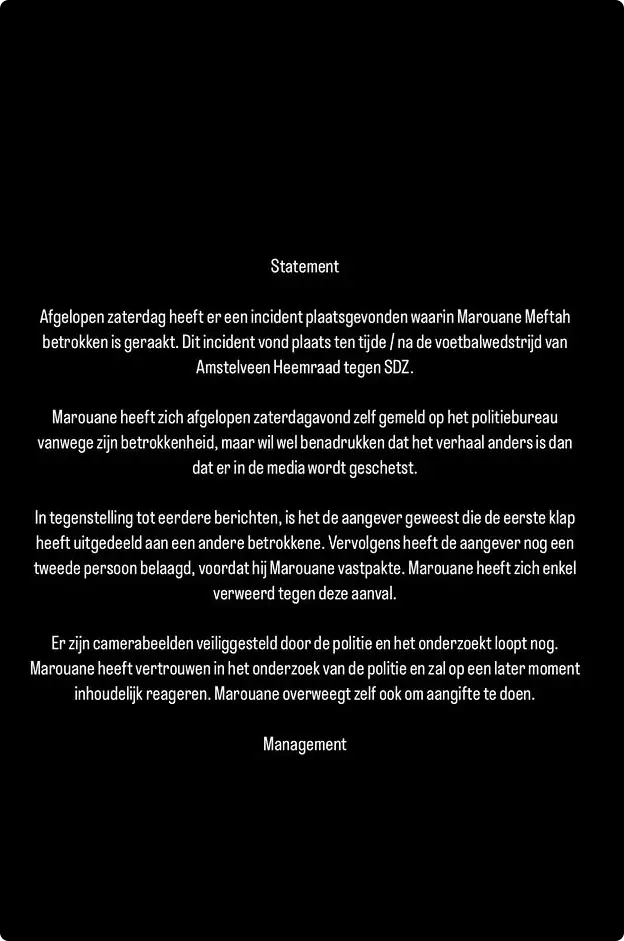 In een verklaring op Instagram stelt het management van de 20-jarige acteur dat "in tegenstelling tot eerdere berichten" het de aangever zelf is geweest "die de eerste klap heeft uitgedeeld aan een andere betrokkene. Vervolgens heeft de aangever nog een tweede persoon belaagd, voordat hij Marouane vastpakte". Het management stelt dat de acteur "zich enkel verweerd" heeft tegen de vermeende aanval.