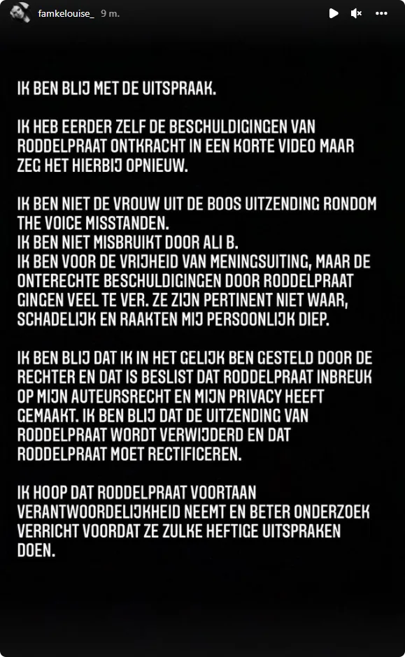 Ze gaat verder: "Ik ben niet de vrouw uit de BOOS-uitzending rondom The Voice misstanden. Ik ben niet misbruikt door Ali B. Ik ben voor de vrijheid van meningsuiting, maar de onterechte beschuldigingen door Roddelpraat gingen veel te ver. Ze zijn pertinent niet waar, schadelijk en raakten mij persoonlijk diep."