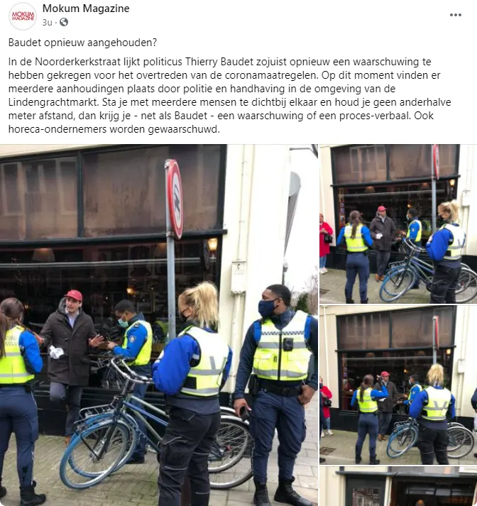 Op foto's, die te zien zijn op de Facebookpagina van Mokum Magazine is te zien hoe de FVD-lijsttrekker omsingeld is door politieagenten. In de Noorderkerkstraat zou Thierry Baudet een waarschuwing van de politie hebben gekregen wegens het overtreden van de coronamaatregelen. Hij zou met teveel mensen op één plek staan zonder afstand te bewaren.