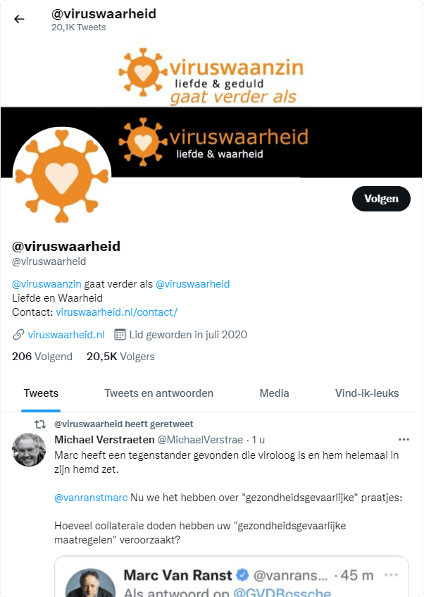 Engel is het niet eens met de schorsing en laat weten Twitter voor de rechter te willen slepen. Zijn derde account onder de naam van Viruswaarheid is nog wel gewoon in de lucht.