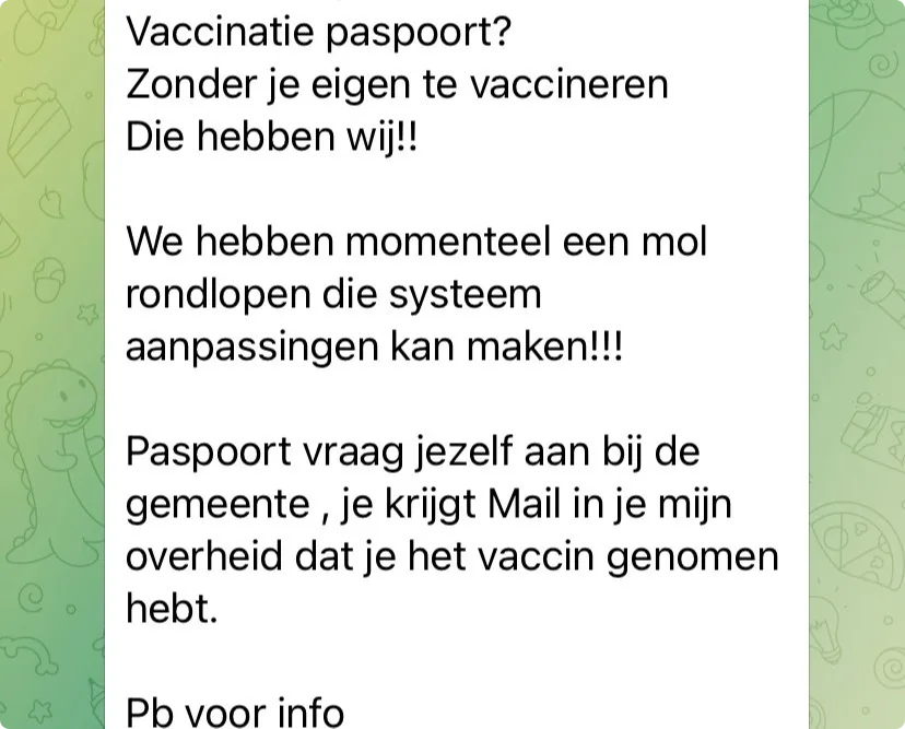 Op de versleutelde berichtendienst Telegram worden via een groot aantal advertenties vaccinatiebewijzen en -registraties aangeboden. Dat blijkt uit onderzoek van Shownieuws.