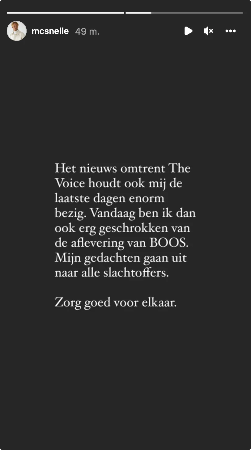 Ook Snelle, die sinds twee seizoenen coach is bij The Voice Kids, reageert ontzet op het onlineprogramma. "Het nieuws omtrent The Voice houdt ook mij de laatste dagen enorm bezig. Vandaag ben ik dan ook erg geschrokken van de aflevering van BOOS. Mijn gedachten gaan uit naar alle slachtoffers."
