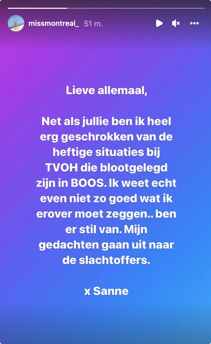 "Net als jullie ben ik heel erg geschrokken van de heftige situaties bij The Voice of Holland die blootgelegd zijn in BOOS", vertelt Sanne Hans, ook wel bekend als Miss Montreal, op haar Instagram. "Ik weet echt even niet zo goed wat ik erover moet zeggen... ben er stil van. Mijn gedachten gaan uit naar de slachtoffers." De zangeres was drie seizoenen lang coach in The Voice.