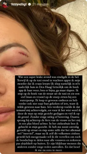 Lizzy liet zelf ook van zich horen. Ze deelde meer details over het zinloze geweld bij een foto van haar gehavende gezicht.