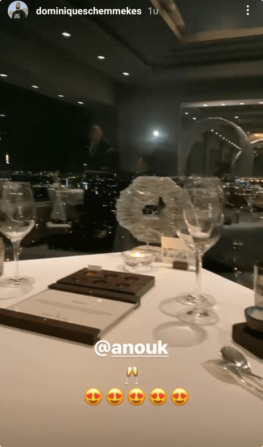 Dominique deelt beelden van de heerlijke avond op zijn Instagram Stories. Hierop is zijn grote liefde Anouk met haar heel korte kapsel te zien. Ze hebben het duidelijk naar hun zin, getuige de onderstaande foto's.