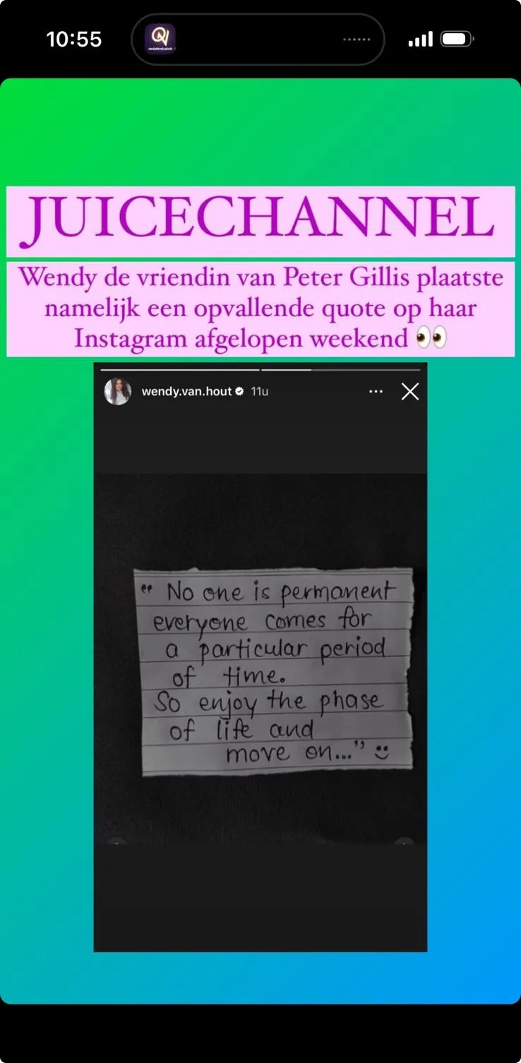 De afgelopen dagen gaan er diverse geruchten de ronde dat zij en Peter uit elkaar zouden zijn, omdat het zo stil zou blijven vanuit hun kant. Bovendien plaatste Wendy afgelopen weekend een cryptisch briefje op Instagram, meldt Juicechannel maandag.