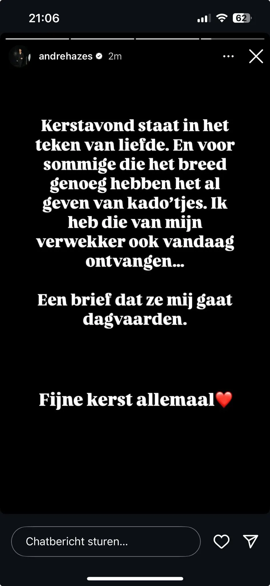 In een cynische Instagram-story schrijft André: "Kerstavond staat in het teken van liefde. En voor sommigen die het breed genoeg hebben, het geven van cadeautjes. Ik heb die van mijn verwekker ook vandaag ontvangen... Een brief dat ze mij gaat dagvaarden. Fijne kerst allemaal."