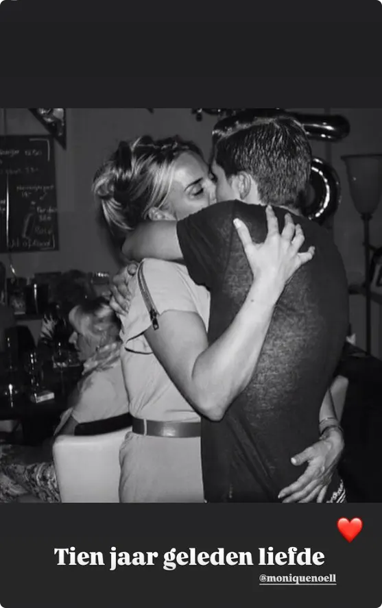 "10 jaar geleden liefde", schrijft hij in zijn Instagram story. Het stel kust elkaar in een stevige omhelzing, zie foto hieronder.