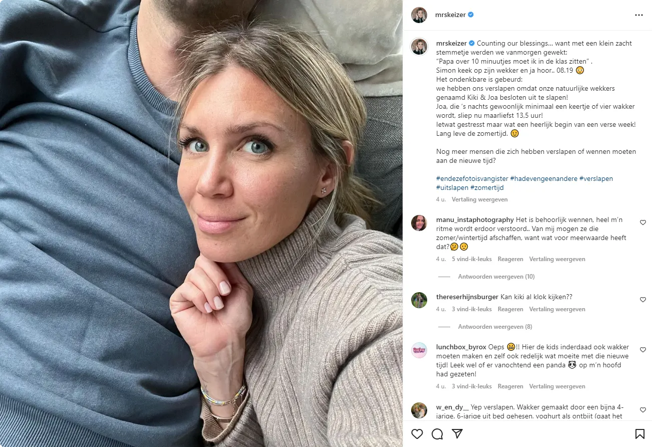 Vervolgens vraagt Annemarie aan haar volgers of zij zich ook verslapen hebben, of moesten wennen aan de nieuwe tijd. De blondine krijgt ontzettend veel reacties. Zo laat iemand weten: "Yep verslapen. Wakker gemaakt door een bijna 4-jarige. 6-jarige uit bed gehesen, yoghurt als ontbijt (gaat het snelst) en zonder tandenpoetsen naar school. Ze was net op tijd." Iemand anders vraagt zich af: "Kan Kiki al klok kijken?"