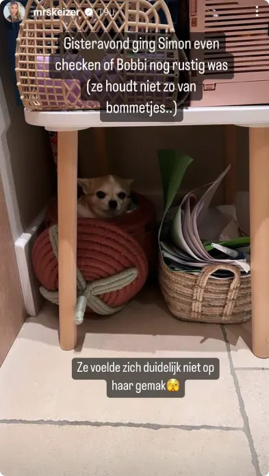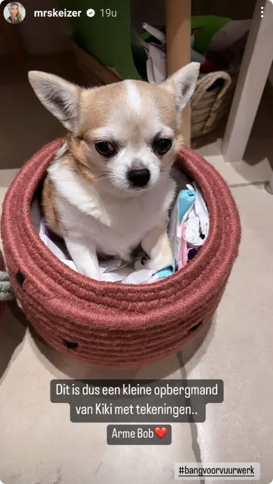 "Dit is dus een kleine opbergmand van Kiki met tekeningen", schrijft ze bij een tweede foto. "Arme Bob." In de hashtag schrijft ze 'bang voor vuurwerk'.