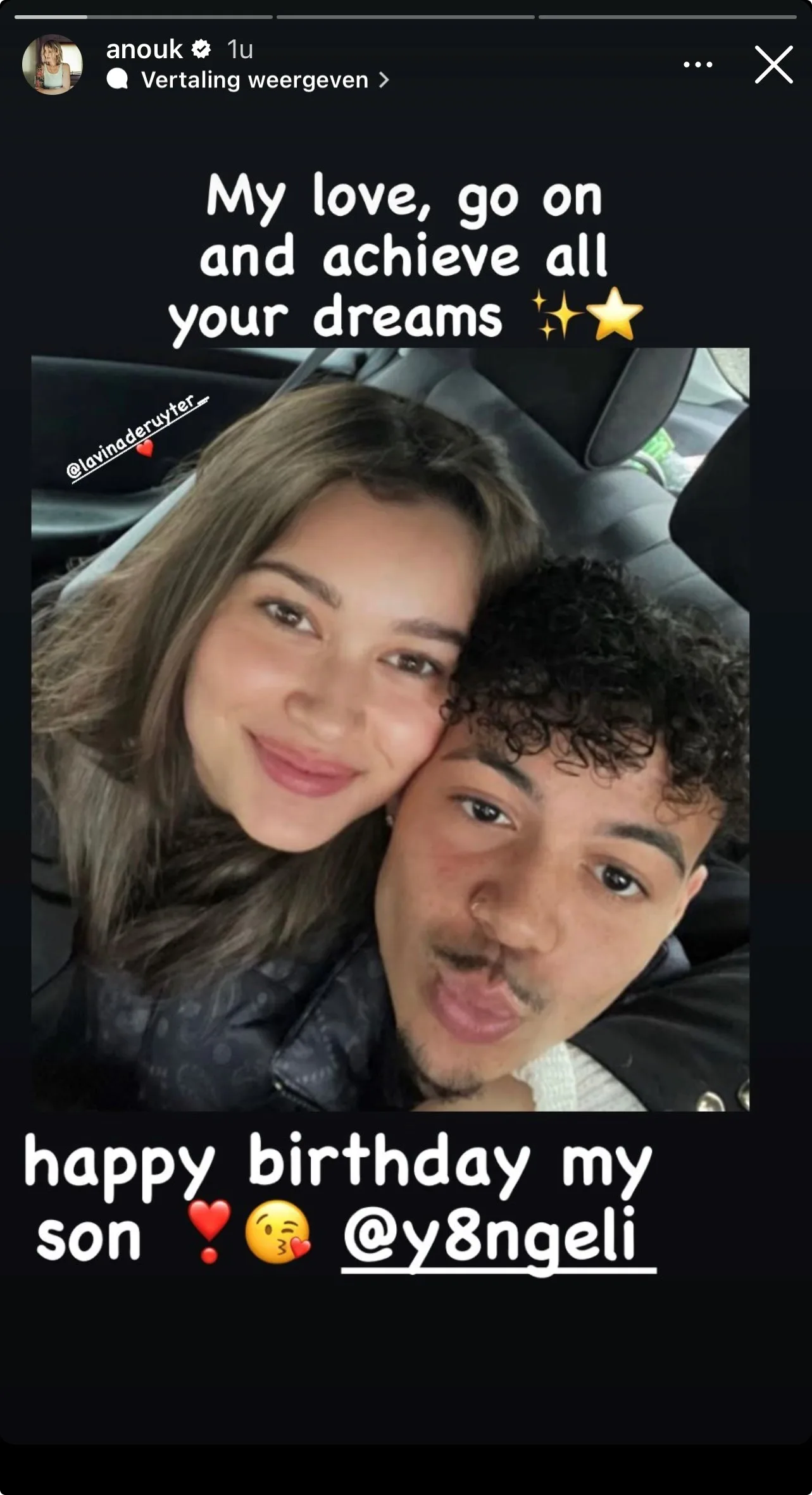 "Mijn liefste, ga door en verwezenlijk al je dromen", zo schrijft Anouk in haar Instagram Stories. "Gefeliciteerd mijn zoon Elijah." De zangeres deelt een liefdevolle foto van hem samen met zijn vriendin Lavina.