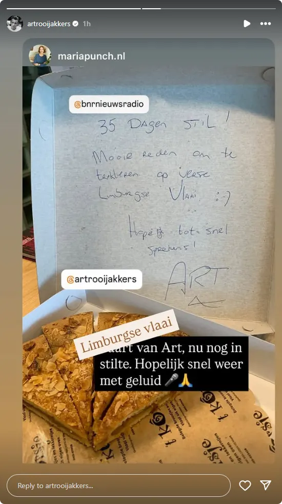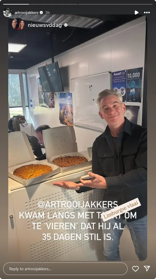 De presentator deelt op Instagram Stories twee foto's. Op de eerste foto is hij te zien met twee taarten op de redactievloer van de SBS6-talkshow Nieuws van de Dag. Op de tweede foto is de taart te zien die Rooijakkers met zijn collega's van BNR Nieuwsradio heeft gedeeld. "Hopelijk tot snel sprekens", heeft hij aan de binnenkant van de doos geschreven.