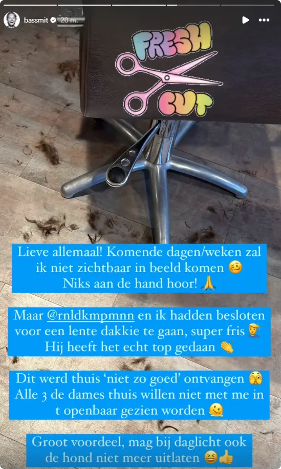Bas schrijft dat hij de komende dagen of zelfs weken niet zichtbaar in beeld zal komen. "Niks aan de hand hoor!", aldus de ondernemer. Hij schrijft dat zijn kapper en hij hebben besloten om voor een "lente dakkie" te gaan. "Superfris. Hij heeft het echt top gedaan." Bas schrijft dat zijn nieuwe look thuis niet zo goed werd ontvangen. "Alle drie de dames thuis willen niet met me in het openbaar gezien worden." Bas kan er gelukkig om lachen, want hij schrijft dat hij een groot voordeel heeft: hij hoeft in het daglicht de hond niet meer uit te laten.