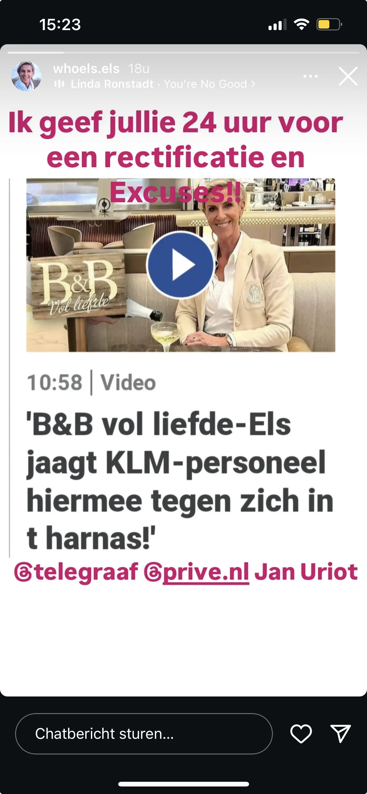 De uitspraken van Jan zijn bij Els in het verkeerde keelgat geschoten. Ze uit haar onvrede openlijk op sociale media en stelt dat De Telegraaf met een rectificatie moet komen. "Ik geef jullie 24 uur voor een rectificatie en excuses!" schrijft ze fel op Instagram Stories. Tot nu toe is de uitzending nog steeds te zien op de website van De Telegraaf.