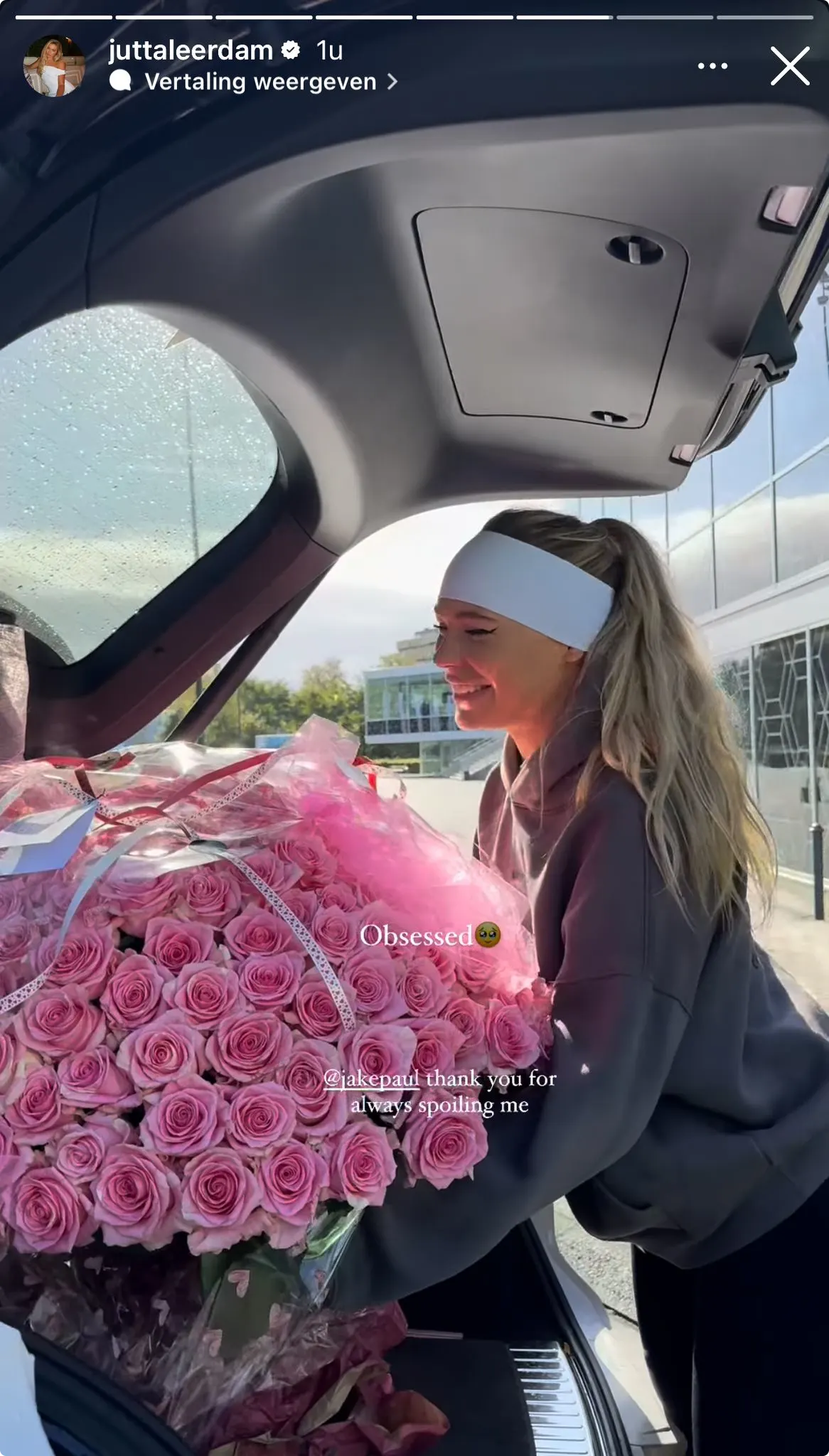 Jutta en Jake zijn namelijk al anderhalf jaar samen. Jutta deelt video's op Instagram van hoe ze toch via de afstand in het zonnetje wordt gezet door haar Jake. De blondine krijgt namelijk een enorm boeket rozen van haar liefje. "Dankjewel voor dat je me altijd verwend", schrijft ze.