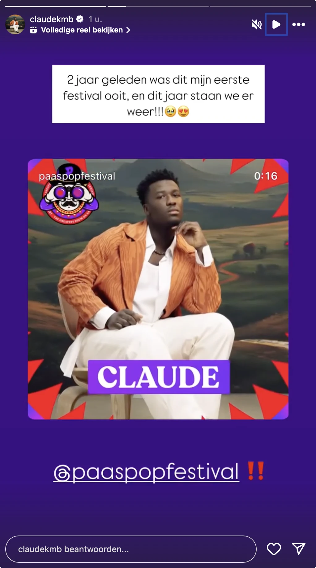 Claude schrijft op zijn Instagram Stories "2 jaar geleden was dit mijn eerste festival ooit en dit jaar staan we er weer!!!", (zien onderstaande foto). Paaspop is voor Claude dus al bekend terrein, dat maakt dit nog specialer voor de zanger.