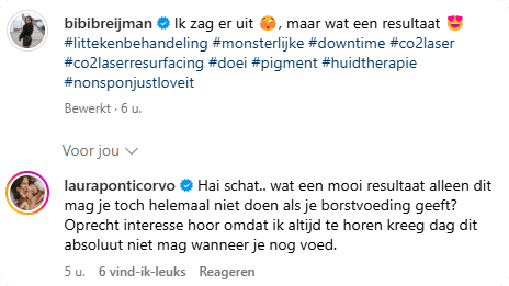"Hai schat.. Wat een mooi resultaat, alleen dit mag je toch helemaal niet doen als je borstvoeding geeft? Oprecht interesse hoor, omdat ik altijd te horen kreeg dat dit absoluut niet mag wanneer je nog voedt", aldus Laura Ponticorvo. Bibi reageert hier vervolgens op met: "Hi Lauwie. Nee er worden geen chemische stoffen gebruikt. Zelfde als dat je een schaafwond hebt en je huid gaat helen. Ik had een hondenblik in m’n kin getrokken en had dus een litteken en zwangerschapspigment."