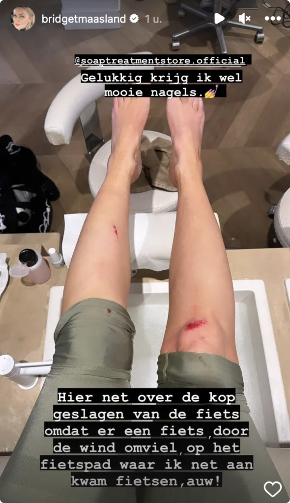 Op weg naar de nagelsalon ging het mis. "Net over de kop geslagen van de fiets, omdat er een fiets door de wind omviel op het fietspad waar ik net aan kwam fietsen. Auw!" schrijft ze bij een foto waarop haar bloedende benen te zien zijn. Bekijk haar bericht hieronder.