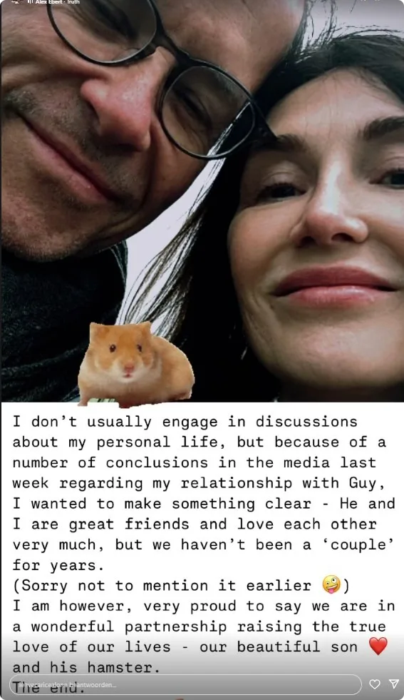 De twee voeden hun kind "en zijn hamster" wel samen op en Carice is daar "heel trots op", zo schrijft ze. "Sorry dat ik het niet eerder heb gemeld."
