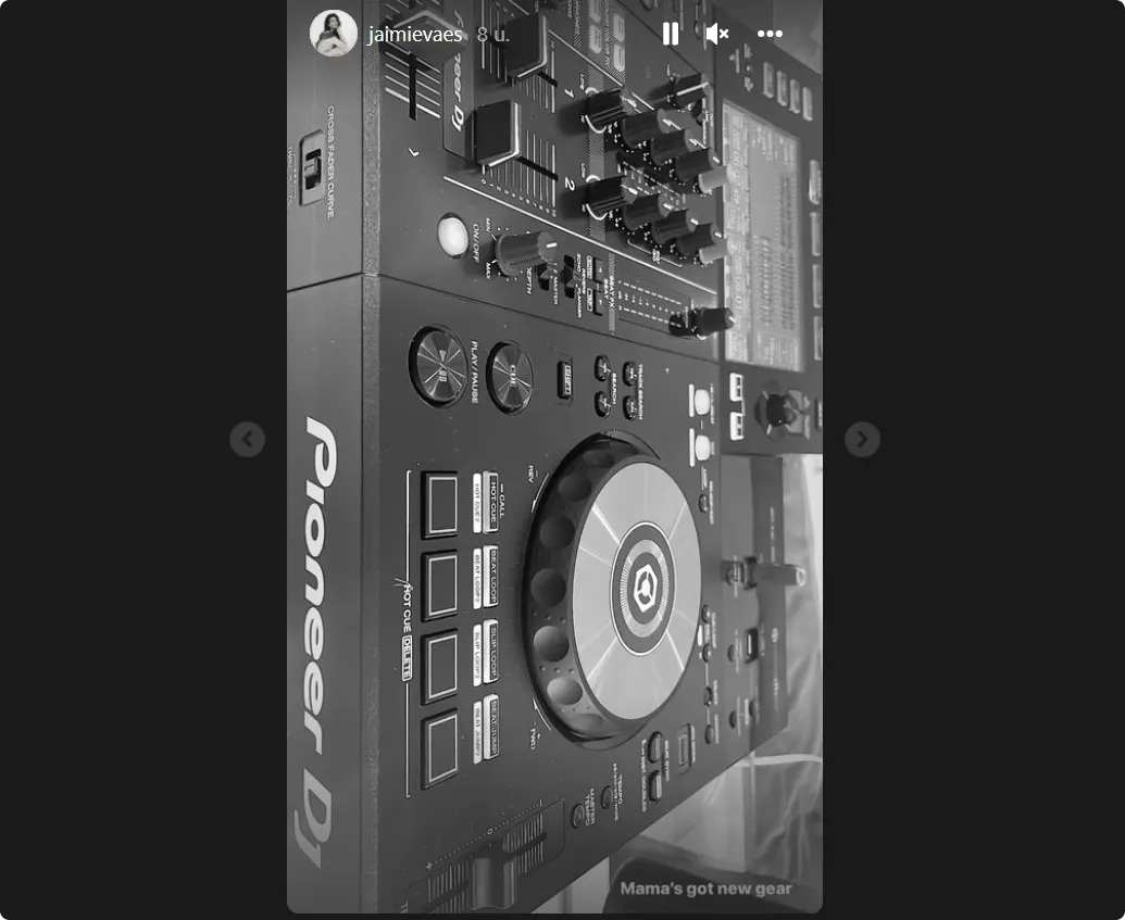Daarna laat ze zien dat ze ergens staat te draaien. Iemand maakt een Instagram Story van Jaimie die haar best staat te doen achter de draaitafel.