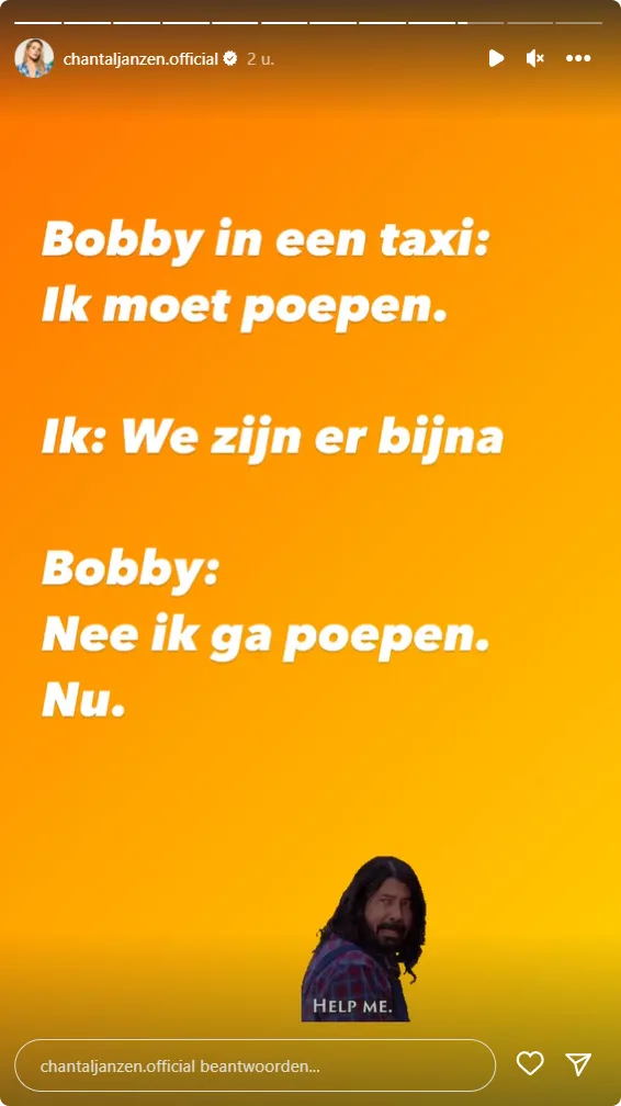 Via Instagram Stories laat Chantal weten wat haar overkwam. "Bobby in een taxi...", begint Chantal haar verhaal. "Ik moet poepen", had haar zoontje gezegd. "We zijn er bijna", had Chantal uitgelegd. Hoewel de blondine waarschijnlijk had gehoopt dat Bobby wel gerust gesteld zou zijn met deze woorden, laat Bobby weten het niet meer te kunnen ophouden... "Nee, ik ga poepen. Nu."
