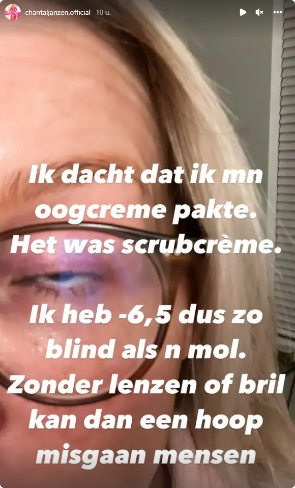 Zo deelt Chantal op Instagram haar verhaal. Tijdens haar avondroutine wilde zij een crème rondom haar ogen smeren, maar dit liep even anders dan gepland. Zo schrijft zij: "Ik dacht dat ik mijn oogcrème pakte. Het was scrubcrème."