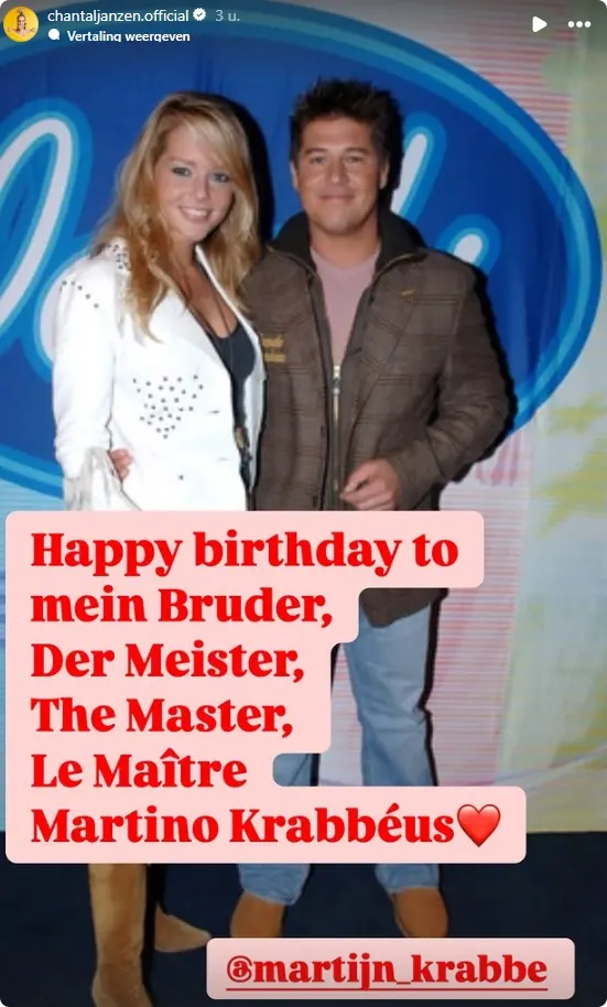 Martijn is woensdag jarig en Chantal staat op Instagram hierbij stil. "Happy birthday to mein Brüder, Der Meister, The Master, Le Maître Martino Krabbéus", schrijft Chantal met een hartje. Ze plaatst een live foto van de twee bij Idols.