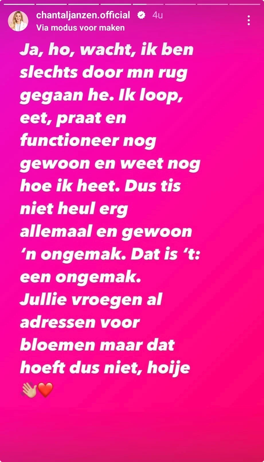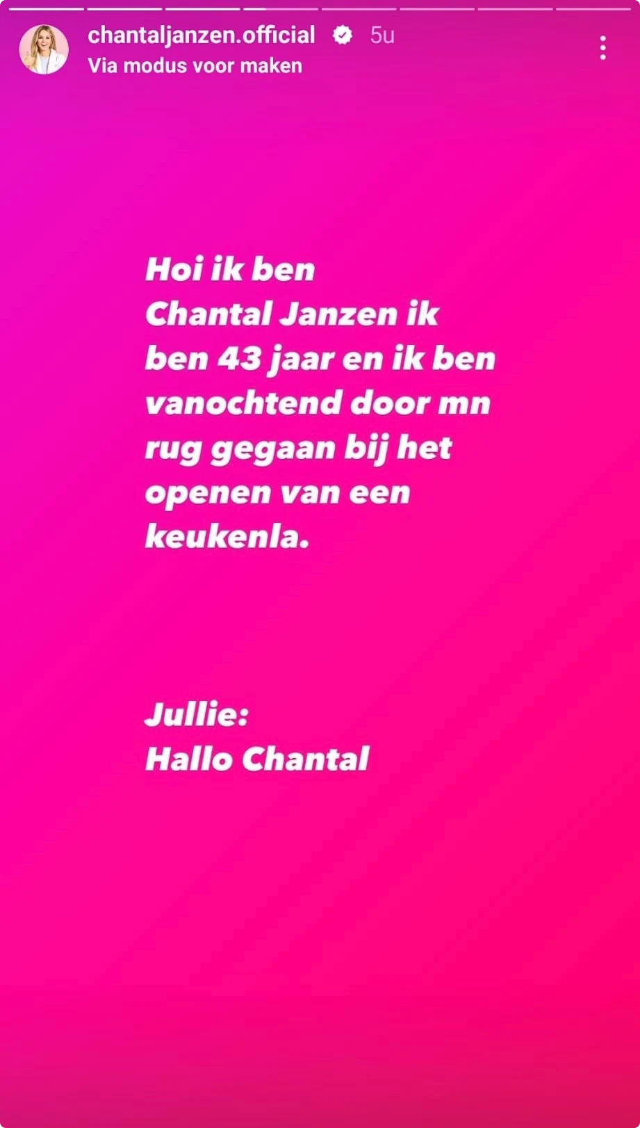 "Hoi ik ben Chantal Janzen, ik ben 43 jaar en ik ben vanochtend door m'n rug gegaan", aldus Chantal in haar Instagram Stories. Ze laat vervolgens weten dat het is gebeurd toen ze de keukenla wilde openen.