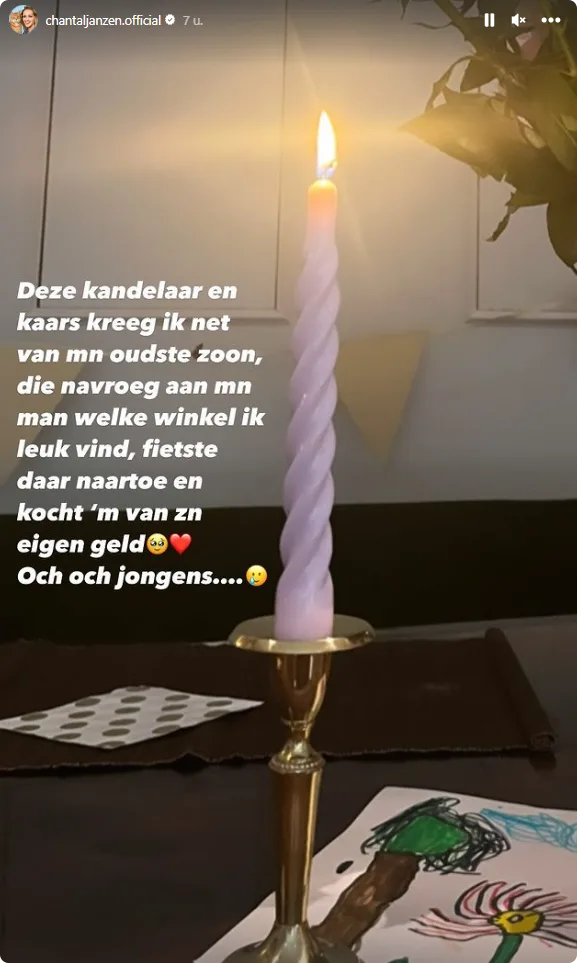 "Deze kandelaar en kaars kreeg ik net van m'n oudste zoon", schrijft ze bij de onderstaande foto. "Die navroeg aan mijn man welke winkel ik leuk vind, fietste daar naartoe en kocht hem van zijn eigen geld."