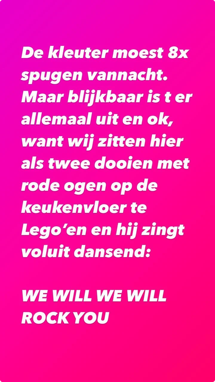 "De kleuter moest 8 keer spugen vannacht", vertelt de presentatrice op instagram. "Maar blijkbaar is het er allemaal uit en oké, want wij zitten hier als twee doden met rode ogen op de keukenvloer te Lego'en en hij zingt voluit dansend: WE WILL WE WILL ROCK YOU."