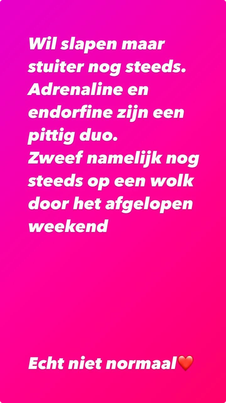 "Wil slapen met stuiter nog steeds", laat de presentatrice weten. "Adrenaline en endorfine zijn een pittig duo. Zweef namelijk nog steeds op een wolk door het afgelopen weekend. Echt niet normaal."