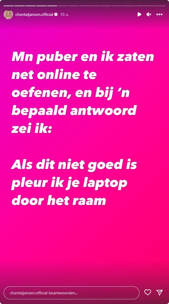 Terwijl Chantal haar puberzoon James zondagavond aan het overhoren was, zei ze bij een bepaald woord: "Als dit niet goed is pleur ik je laptop door het raam." Vervolgens realiseert de blondine zich dat ze even moeten pauzeren. "Althans, ik", bekent Chantal in haar Instagram Stories.