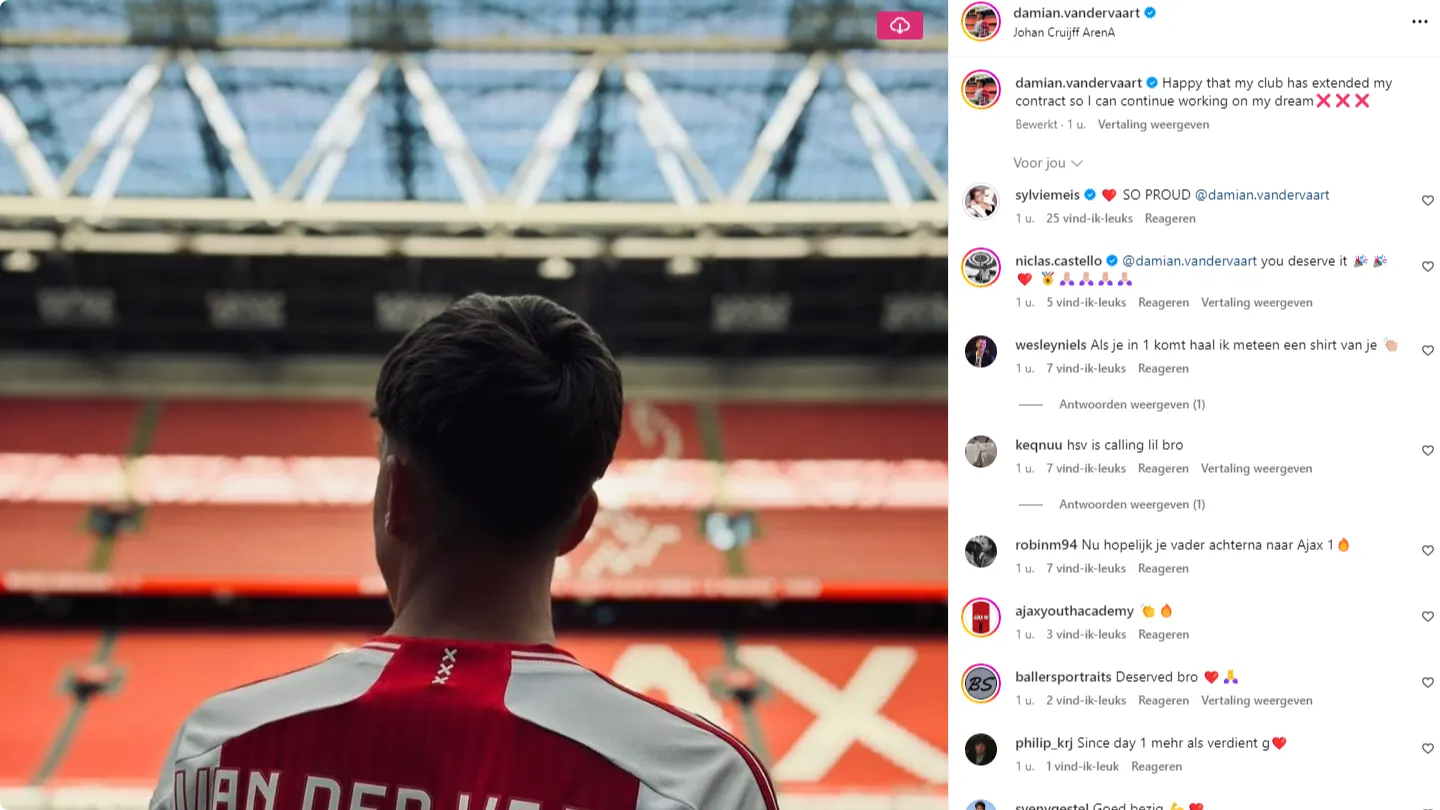 Damián van der Vaart, de zoon van oud-speler Rafael van der Vaart en Sylvie Meis, deelt fantastisch nieuws: zijn contract bij Ajax (zie video) is verlengd, zo laat hij weten op Instagram.