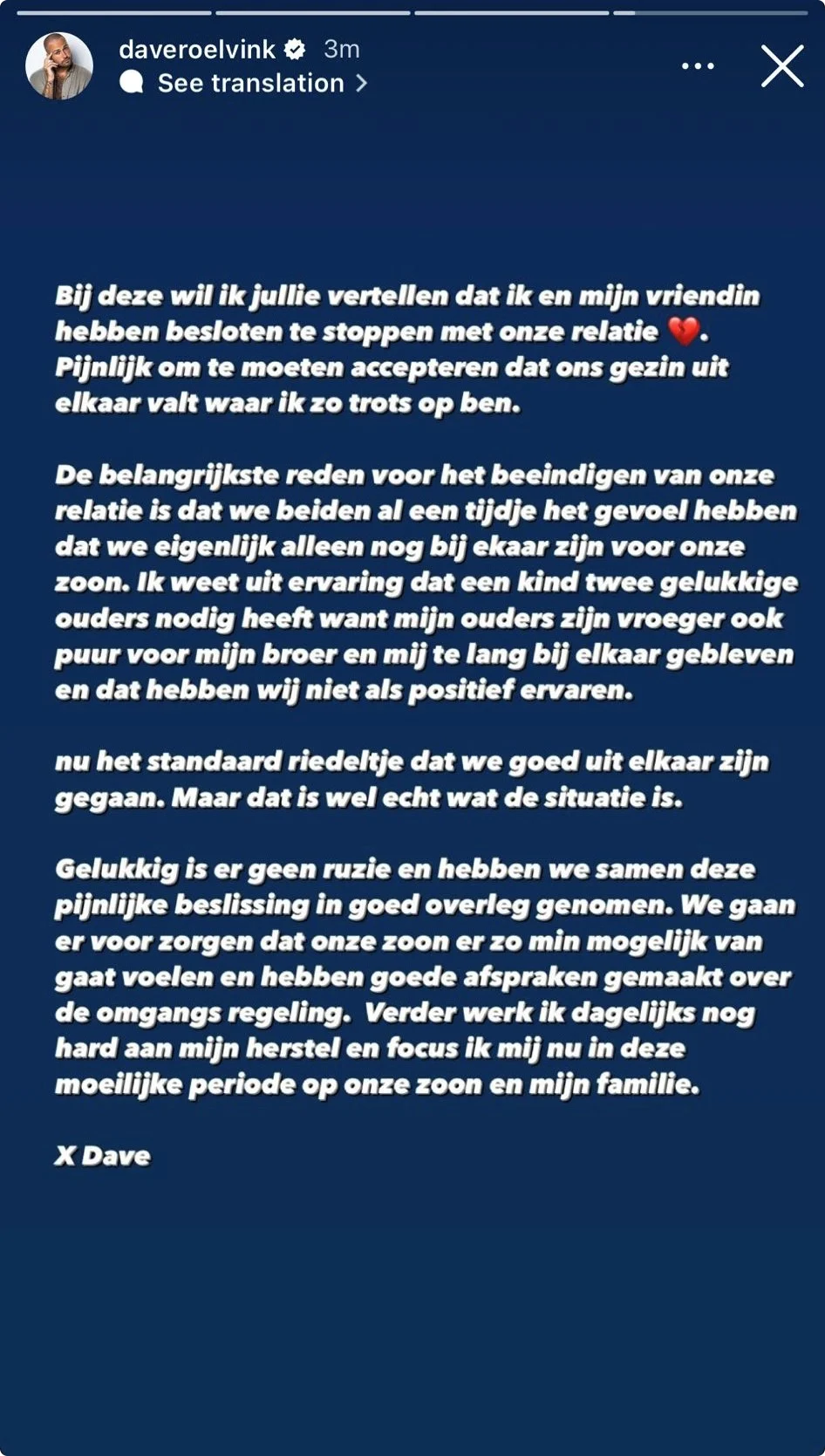 "Bij deze wil ik jullie vertellen dat ik en mijn vriendin hebben besloten te stoppen met onze relatie", zo schrijft Dave in zijn Instagram Stories. "Pijnlijk om te moeten accepteren dat ons gezin uit elkaar valt waar ik zo trots op ben."
